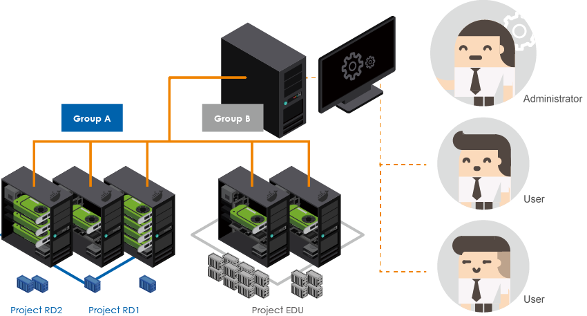 | GPU服务器资源管理模式 | GDMS让软体管理者能够管理位于GPU服务器中的所有建立出来的专案(Project)和容器(Container)。 透过两种专案/容器管理模式来分配GPU资源: