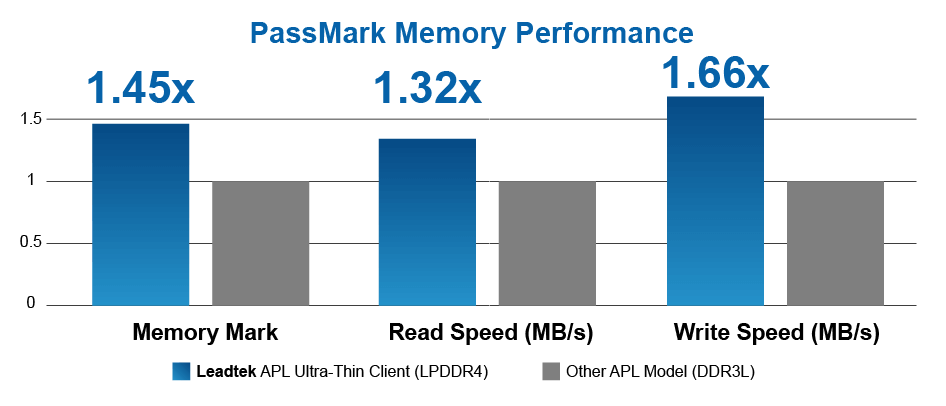 采用更快、更省电的 LPDDR4,让低功耗、高效能不再是二择一的难题,LPDDR4双倍于前代LPDDR3的资料率,让使用者流畅体验双4K UHD显示与多程序运行的优异效能,且省下较LPDDR3 37%电力消耗。 根据实际PassMark存储器效能评比,丽台Apollo Lake Ultra-Thin Client精简型计算机较使用 DDR3L的相同平台,高出45%的效能表现,是能提供使用者胜过传统精简型计算机更高生产力、更低碳足迹的新一代精简型计算机。