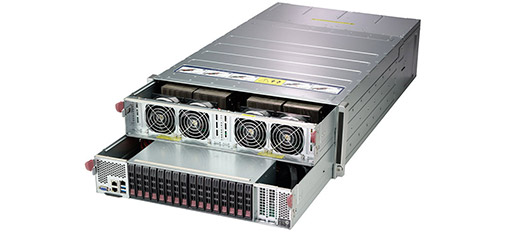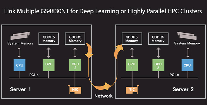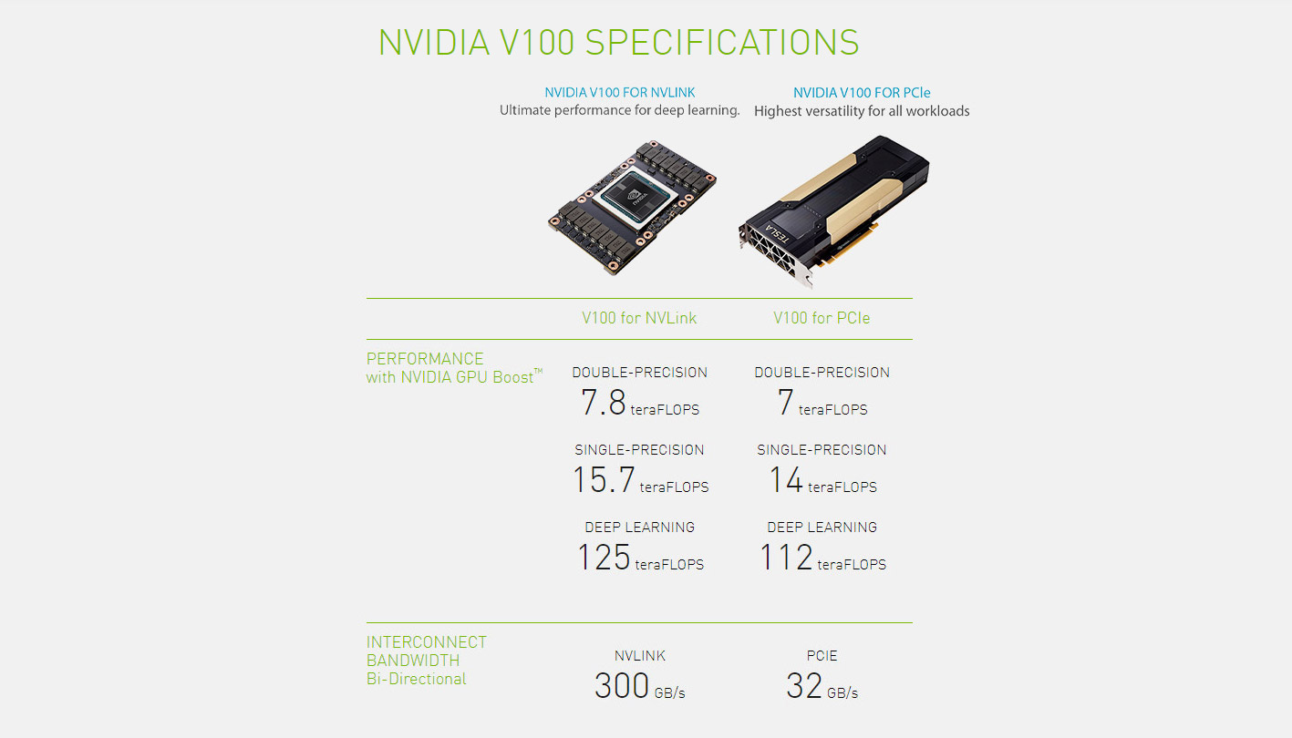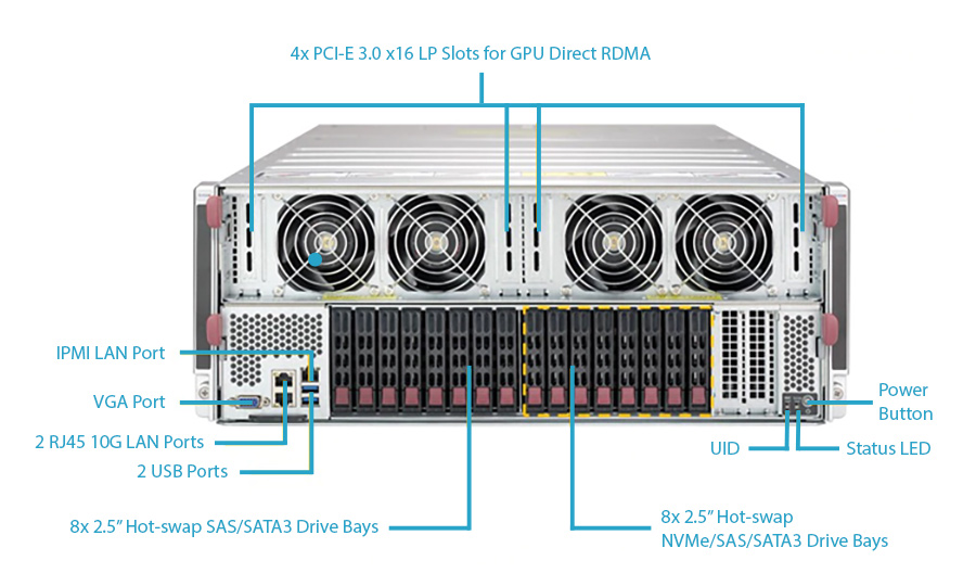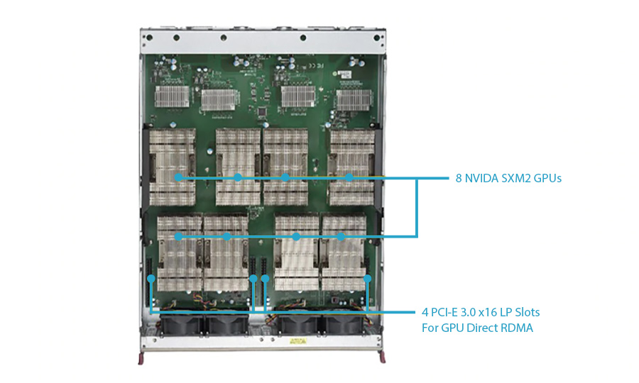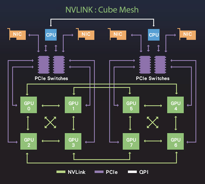 该系统⽀持 8 个 Tesla SXM2 V100 GPU,这些 GPU 安装在 GPU 主板附加模块上,该模块通过中面板连接到主板。GPU 主板透过 Nvidia 的 Cube Mesh NVLINK 架构连接。所有 GPU 之间的直接连接是单个 NVlink(25 GB/s)。可以从 PCI-E PLX 交换机到前端的 PCI-E3.0 x16 提供从 GPU 到网络的直接连接。每个 PCI-E PLX 交换机都是两个 SXM2 模块和一个 PCI-E3.0 x16 插槽的根。安装在转接卡上的快速网络(扩展)卡可以提供很高的速度。数据可以从 GPU 到 PLX 再到 NIC,而无需通过 CPU。对于 NIC,系统可以同时支持 FDR 和 EDR (在 x16 插槽中)。