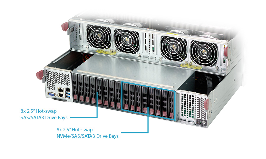 Backplane | 16-port 2U SAS3 12Gbps hybrid backplane, support up to 8x 2.5" SAS3/SATA3 HDD/SSD and 8x SAS3/SATA3/NVMe Storage Devices |