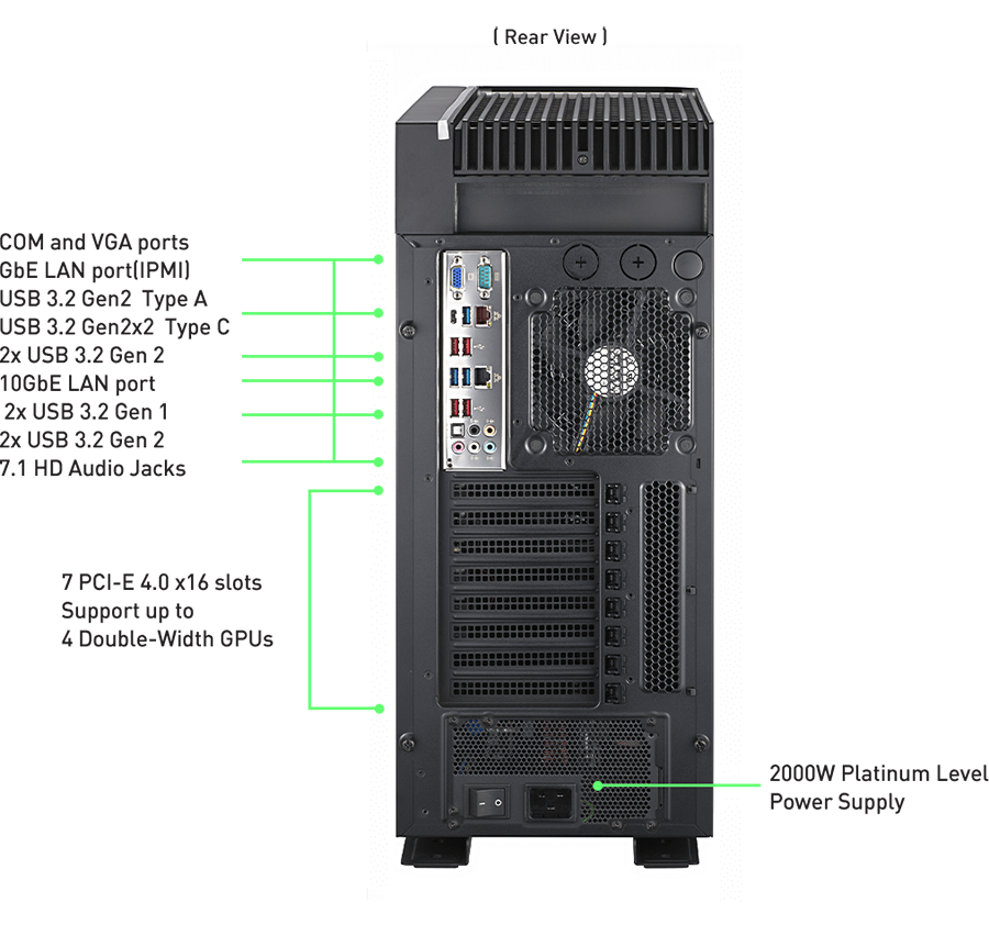 | USB | Front side: 1x USB 3.2 Gen 1 Type C 2x USB 3.2 Gen 1 Type A 2x USB 2.0 Rear side: 5x USB 3.2 Gen2 Type A 1x USB 3.2 Gen2x2 Type C 2x USB 3.2 Gen 1 Type A |