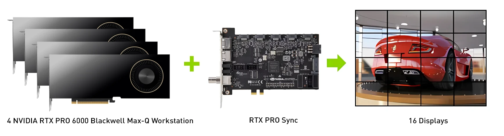 用RTX PRO Sync 可在一台系統內同步 4 張 RTX PRO 或 RTX GPUs, 最高可使用 2 張 RTX PRO Sync 則可同步 8 張 GPUs. 並可提供高達 32 個螢幕輸出。