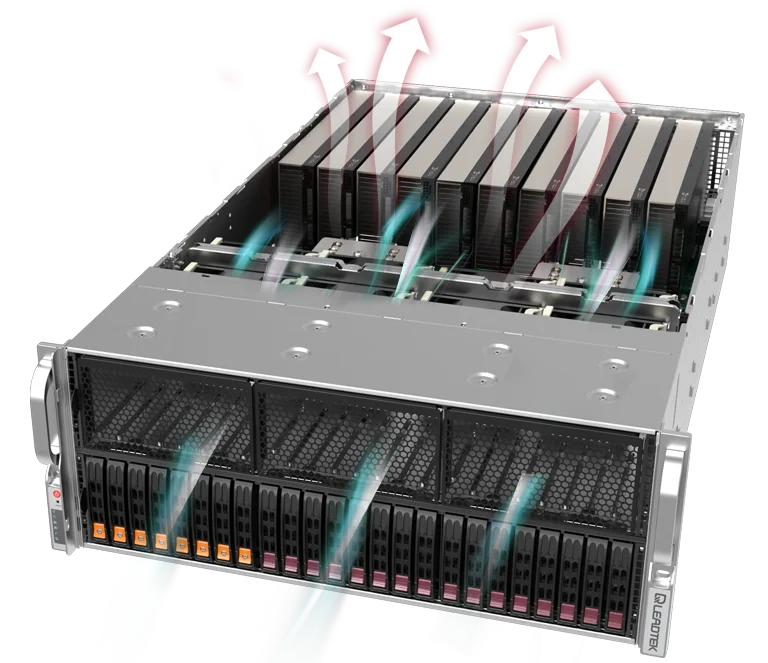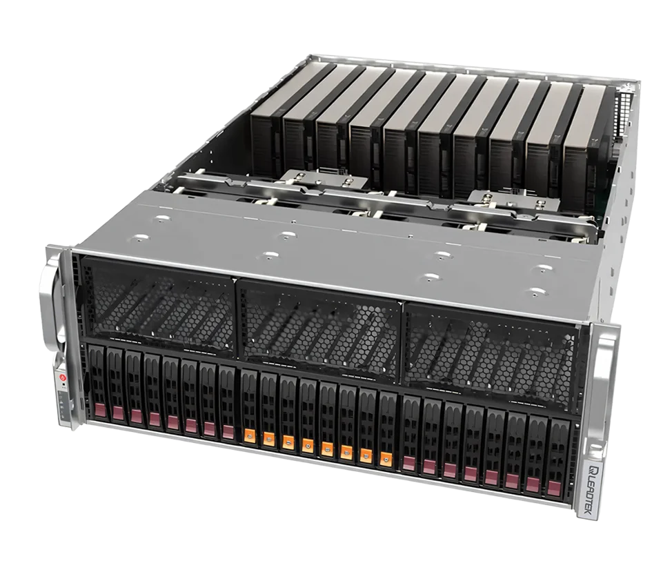 WinFast GS4855T features a powerful GPU architecture that supports up to 10 double-width GPUs in a 4U server, including NVIDIA® H100/L40/L40S/A100/A6000/6000 Ada, to enable scaling of performance in order to meet the demands of AI, high-performance computing, and 3D rendering applications.