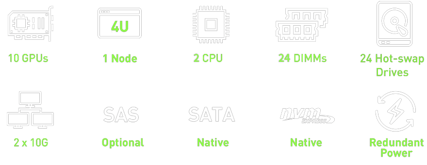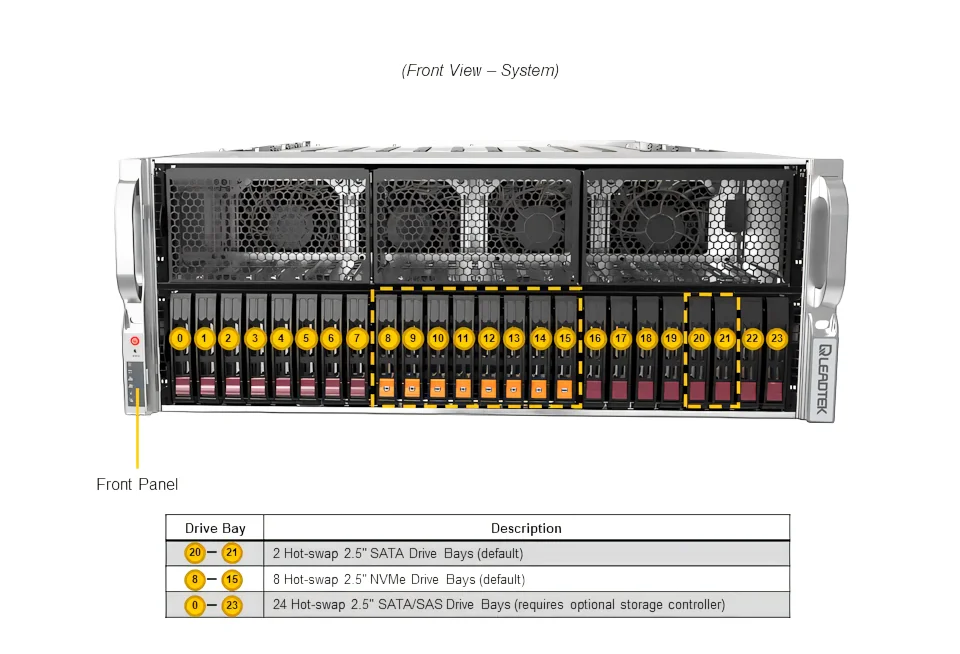 | 24x 2.5" hot-swap NVMe/SATA/SAS drive bays (8x 2.5" NVMe and 2x SATA drives supported by default) | |