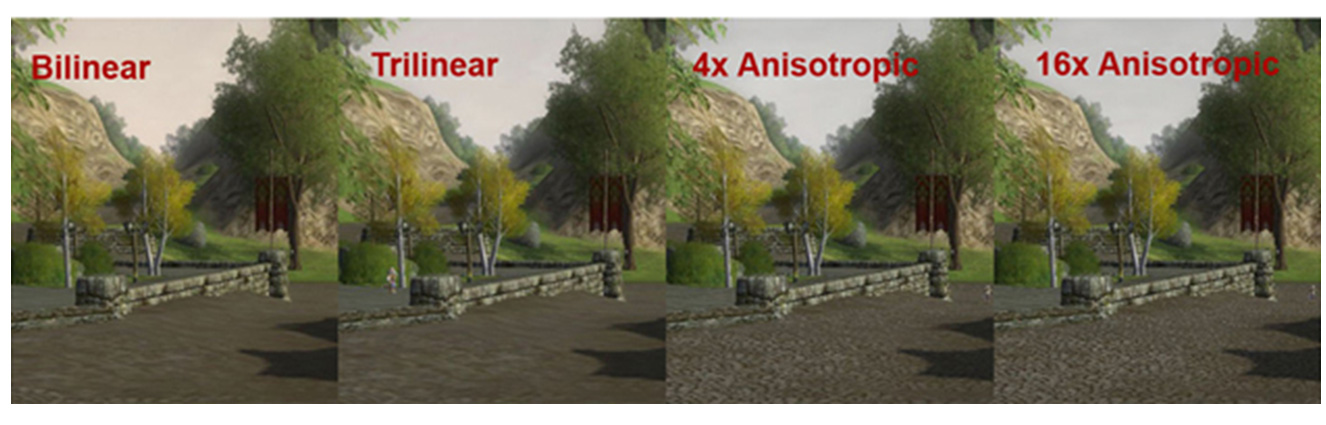 非等方性过滤改善了游戏里贴图对象的清晰度和锐利度。 纹理为将拥有颜色、透明度、反射性及凹凸(法量)等多类数据的影像贴在 物体上,并由GPU进行处理,以在屏幕上呈现逼真的外观