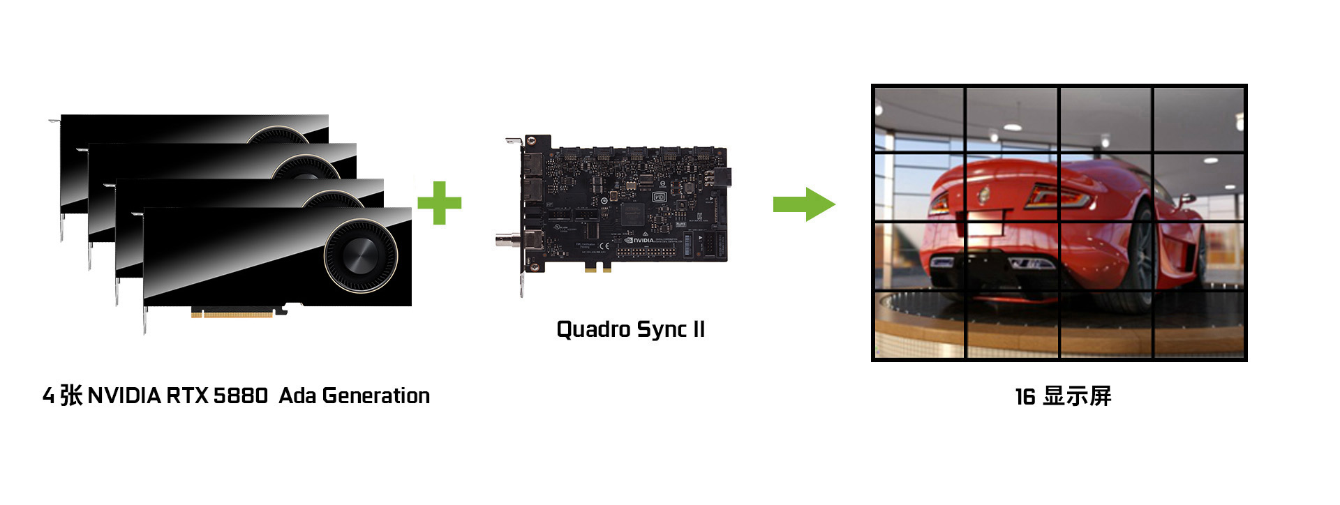 在单一系统的 8 个 GPU 中同步最多 32 个显示器的显示和画面输出 (通过两张 Sync II 同步卡连接),减少建立高级影像可视化环境所需的机器数量。