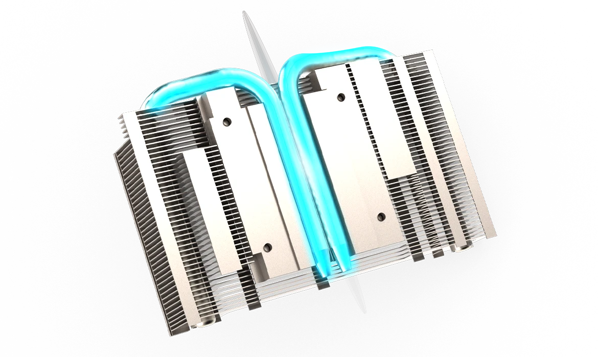 搭載2根8mm大尺寸導熱管和大型鋁鰭片,配合9cm大風扇,可快速且有效率的將溫度冷卻。