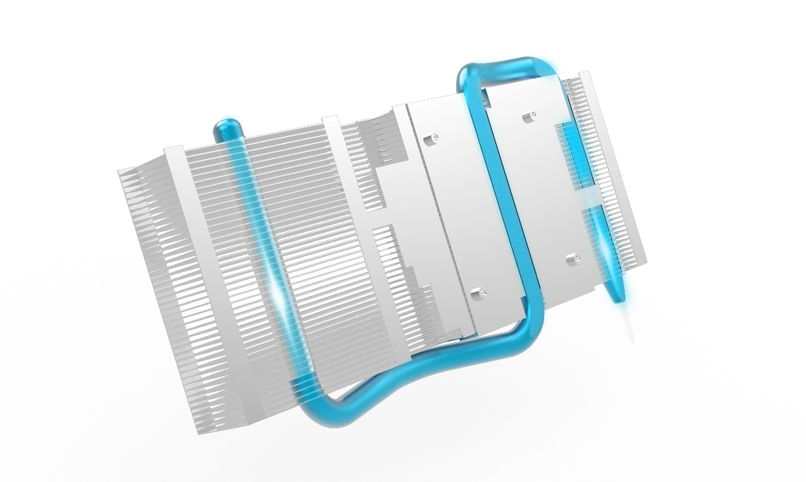 搭載1根8mm大尺寸導熱管和大型鋁鰭片,配合2顆大風扇,可快速且有效率的將溫度冷卻。
