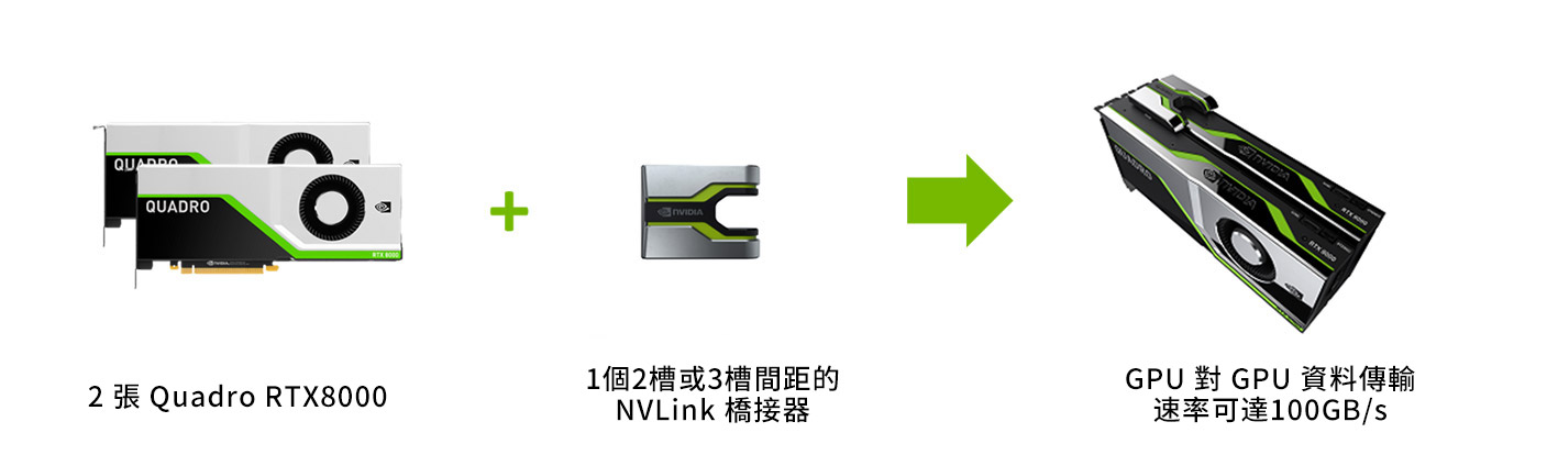 用 NVLink 連接兩張 Quadro RTX 8000 將有效可用記憶體加倍,並可利用高達 100GB/s (雙向總頻寬) 的 GPU 對 GPU 資料傳輸率將應用程式效能擴張 。