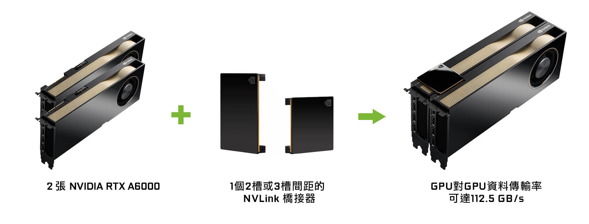 通過以高達112.5 GB / s(總頻寬)的速率實現GPU到GPU的數據傳輸,將兩張RTX A6000卡與NVLink相連,可以有效將記憶體空間增加一倍,並擴展應用程式效能。