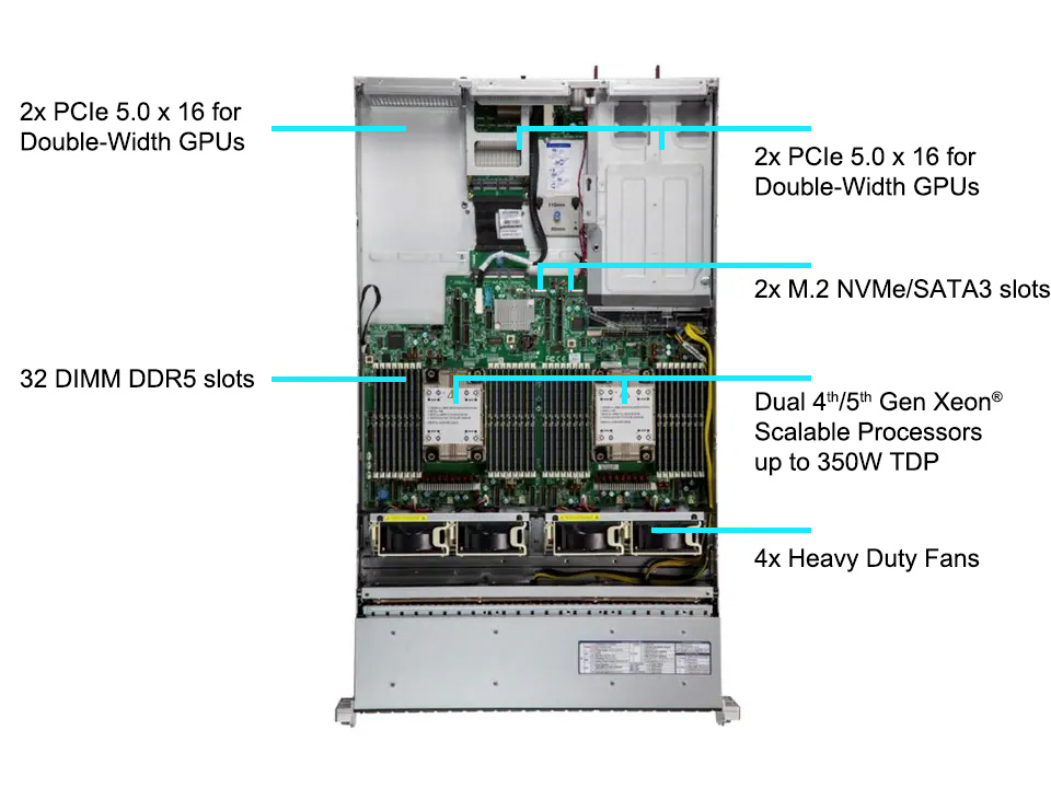 | 電源 | 2x 1200W 1U Redundant Power Supplies with PMBus (Optional 2000W Redundant power supply for 4pcs 250W GPU) (Optional 2600W Redundant power supply for 4pcs 300W GPU) |