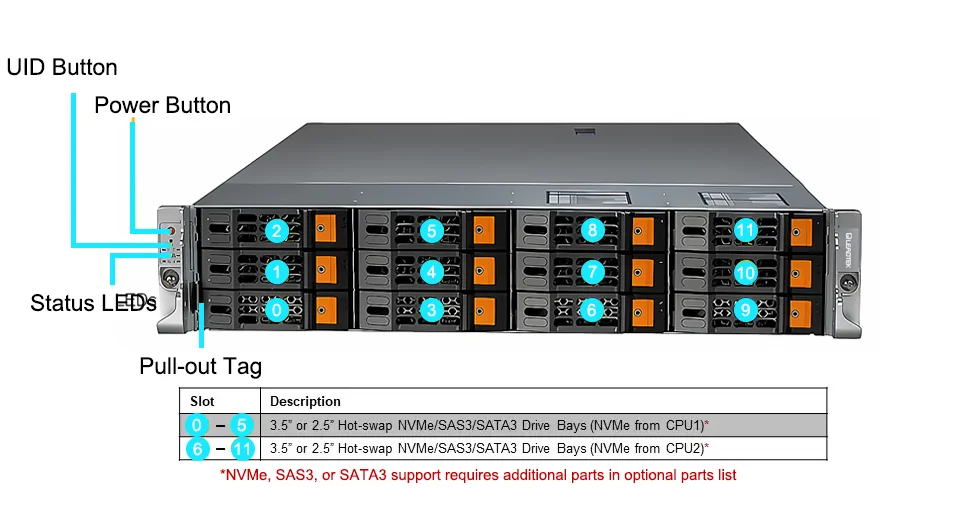 | 熱插拔 | 12x 3.5”/2.5” hot-swap NVMe/SATA/SAS drive bays |