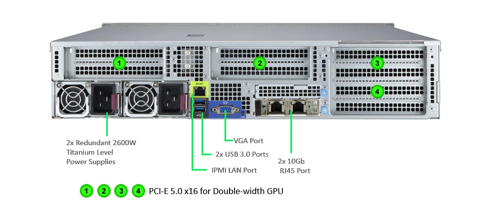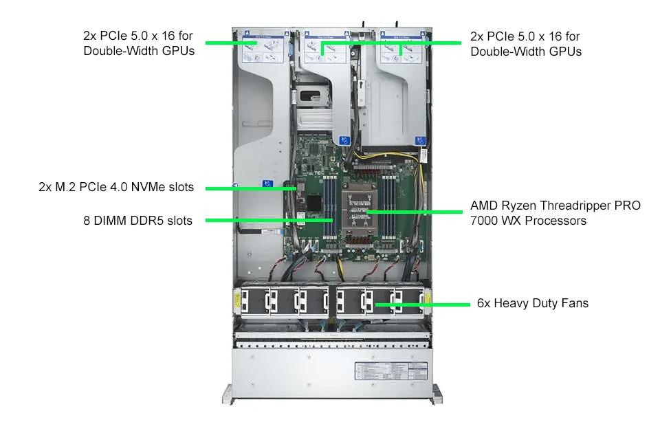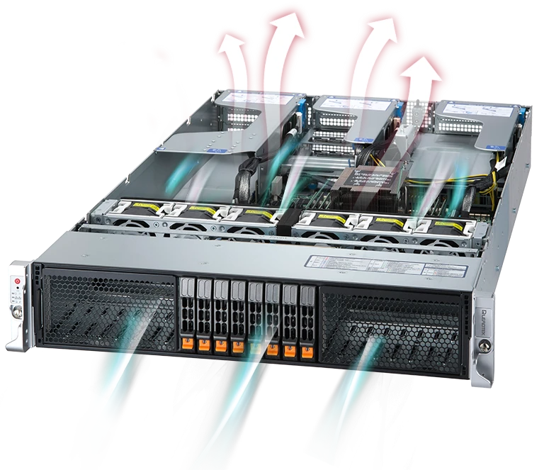 WinFast GS2055 ST 可支援多達 4 個無風扇雙寬度GPU, 如NVIDIA H100/L40S 或 4個內建主動型風扇的NVIDIA RTX 6000 Ada/5000 Ada/4000 Ada, 發揮多 GPU的運算效能, 符合 AI 深度學習/3D繪圖/模擬等應用的需求。