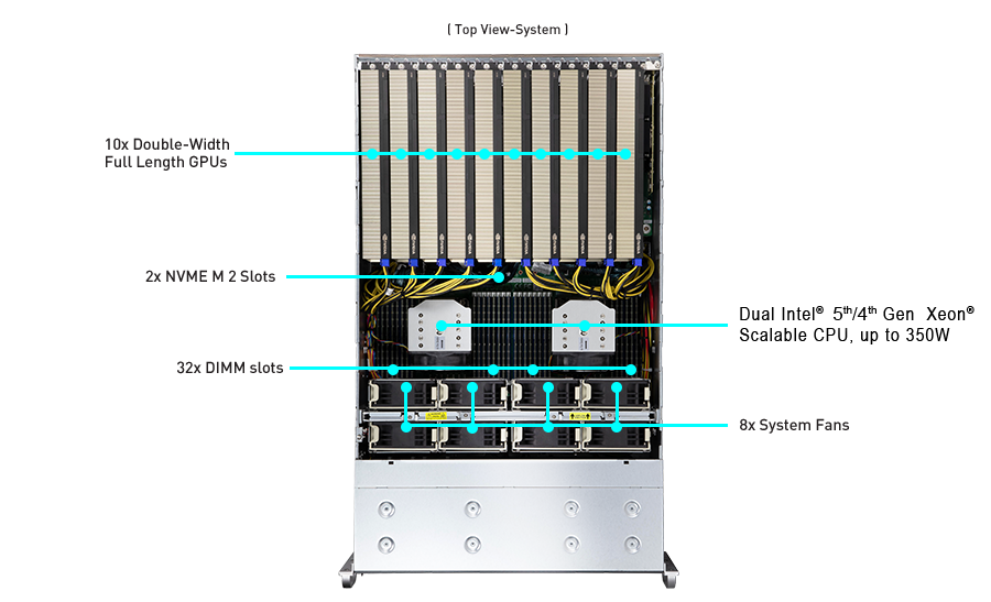 WinFast GS4850T 可支援多達 10 個雙寬度GPU的高效能伺服器, 可以支援 NVIDIA GPU, 包括 H100/A100/A40/A30/A10/A6000/6000 Ada 並可以搭配 NVLink 橋接器, 擴展多 GPU的運算效能, 符合 AI 深度學習/3D繪圖/模擬等應用的需求。