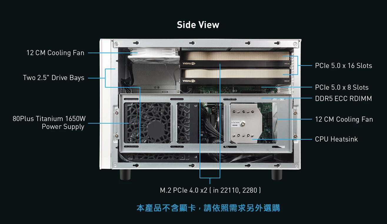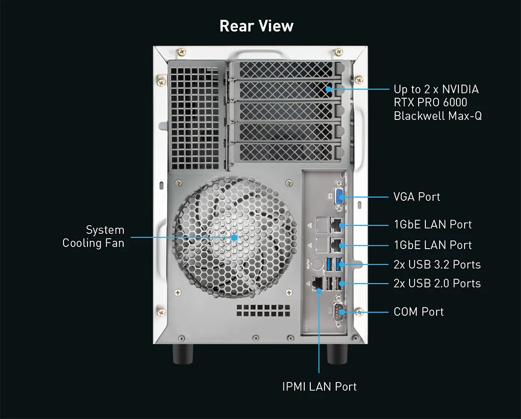 支援高達 2 張 RTX PRO 6000 Max-Q Workstation Edition GPUs,單機擁有 192GB GPU 記憶體,滿足 LLM 及生成式 AI 等多任務需求