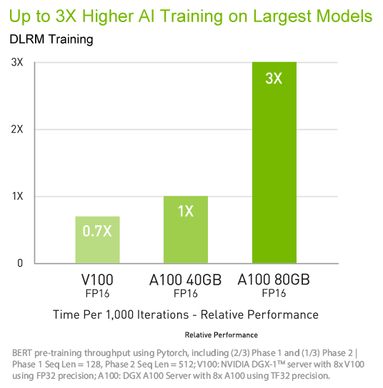 For the largest models with massive data tables like deep learning recommendation models (DLRM), A100 80GB reaches up to 1.3 TB of unified memory per node and delivers up to a 3X throughput increase over A100 40GB.