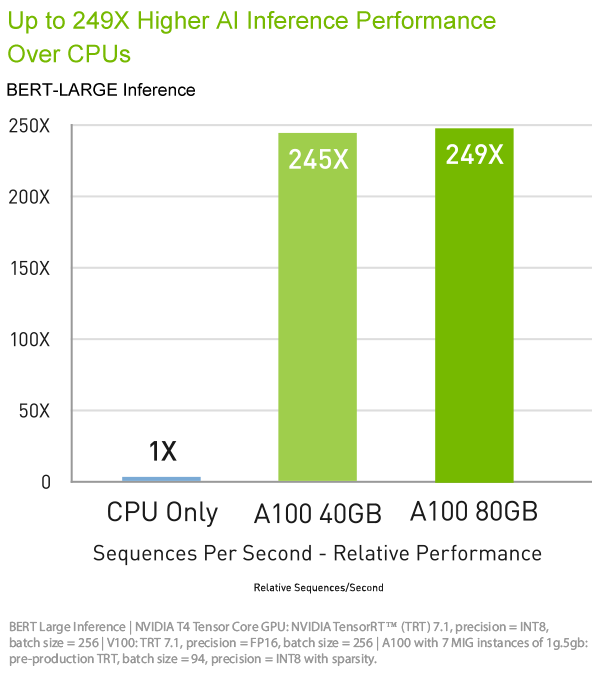 On state-of-the-art conversational AI models like BERT, A100 accelerates inference throughput up to 249X over CPUs.