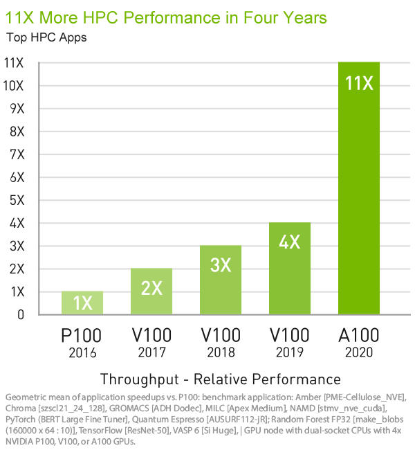 NVIDIA A100 introduces double precision Tensor Cores to deliver the biggest leap in HPC performance since the introduction of GPUs. Combined with 80GB of the fastest GPU memory, researchers can reduce a 10-hour, double-precision simulation to under four hours on A100. HPC applications can also leverage TF32 to achieve up to 11X higher throughput for single-precision, dense matrix-multiply operations.
