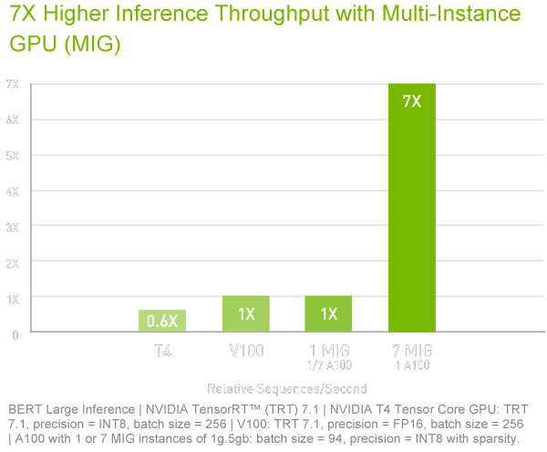 A100 introduces groundbreaking features to optimize inference workloads. It accelerates a full range of precision, from FP32 to INT4. Multi-Instance GPU (MIG) technology lets multiple networks operate simultaneously on a single A100 for optimal utilization of compute resources. And structural sparsity support delivers up to 2X more performance on top of A100’s other inference performance gains.