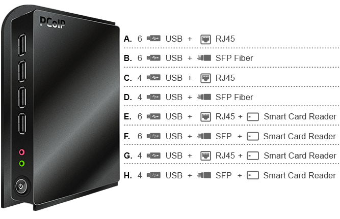 | (Smart card reader zero clients have one front USB connector) | Forth Single-link DVI-D or DisplayPort connector | Two or four front USB 2.0 connectors** | |
