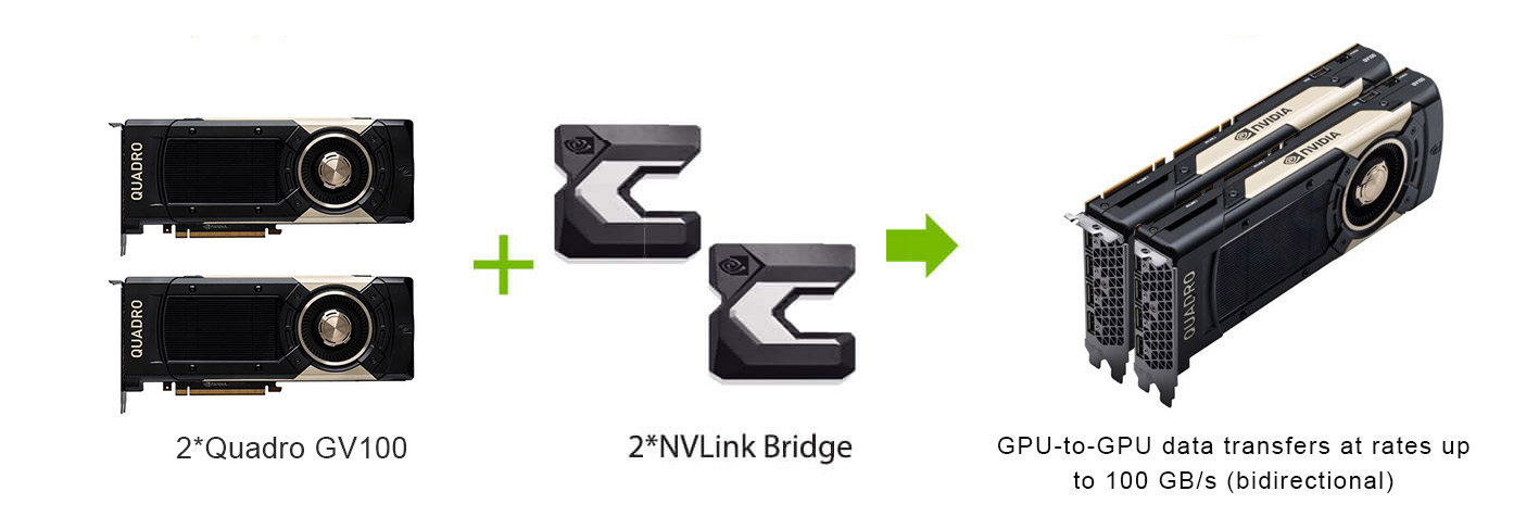 Connect a pair of Quadro GV100 cards with NVLink to increase the effective memory footprint and scale application performance by enabling GPU-to-GPU data transfers at rates up to 100 GB/s (bidirectional) for a total bandwidth of 200 GB/s.