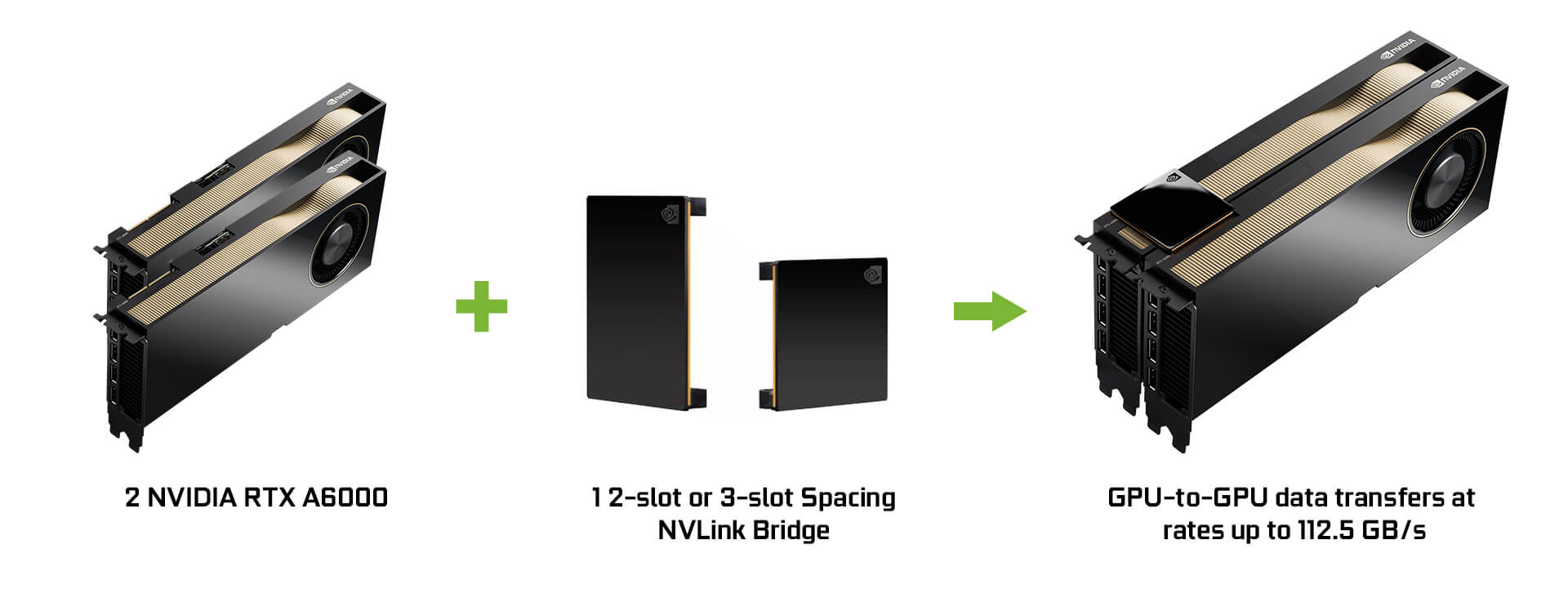 Connect two RTX A6000 cards with NVLink to double the effective memory footprint and scale application performance by enabling GPU-to-GPU data transfers at rates up to 112.5 GB/s (total bandwidth).