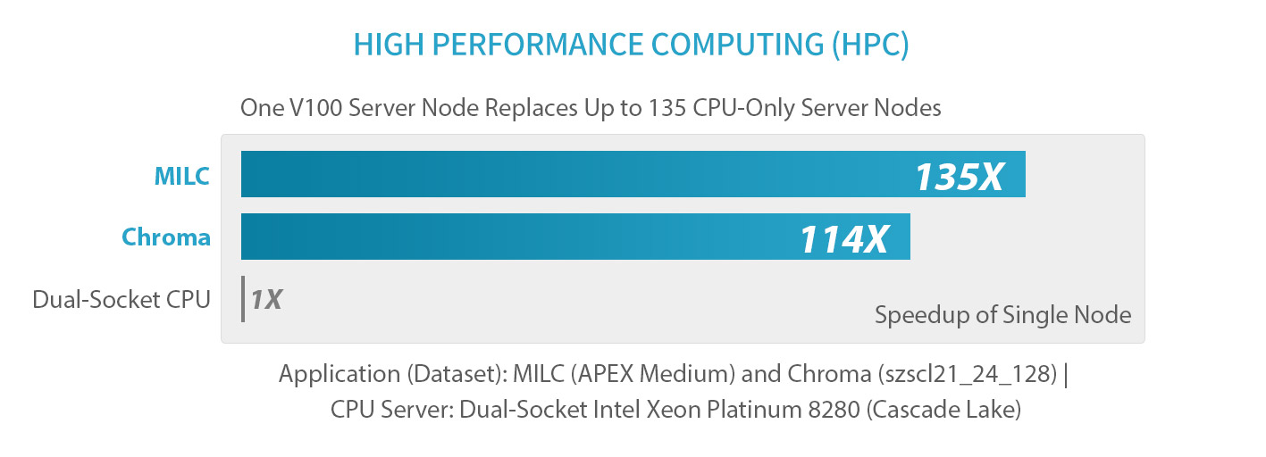 V100 is engineered for the convergence of AI and HPC. It offers a platform for HPC systems to excel at both computational science for scientific simulation and data science for finding insights in data. By pairing NVIDIA CUDA® cores and Tensor Cores within a unified architecture, a single server with V100 GPUs can replace hundreds of commodity CPU-only servers for both traditional HPC and AI workloads. Every researcher and engineer can now afford an AI supercomputer to tackle their most challenging work
