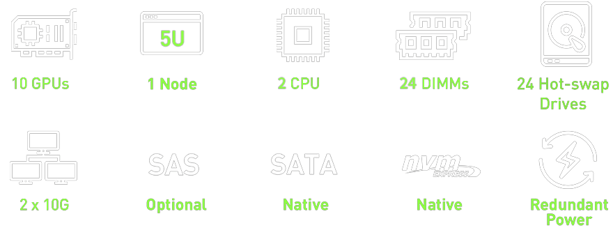 WinFast GS5855T features a powerful GPU architecture that supports up to 10 double-width GPUs in a 5U server, including NVIDIA® H200 NVL/H100 NVL/NVIDIA RTX PRO™ 6000 Blackwell Server Edition/L40S, to enable scaling of performance in order to meet the demands of AI, high-performance computing, and 3D rendering applications.