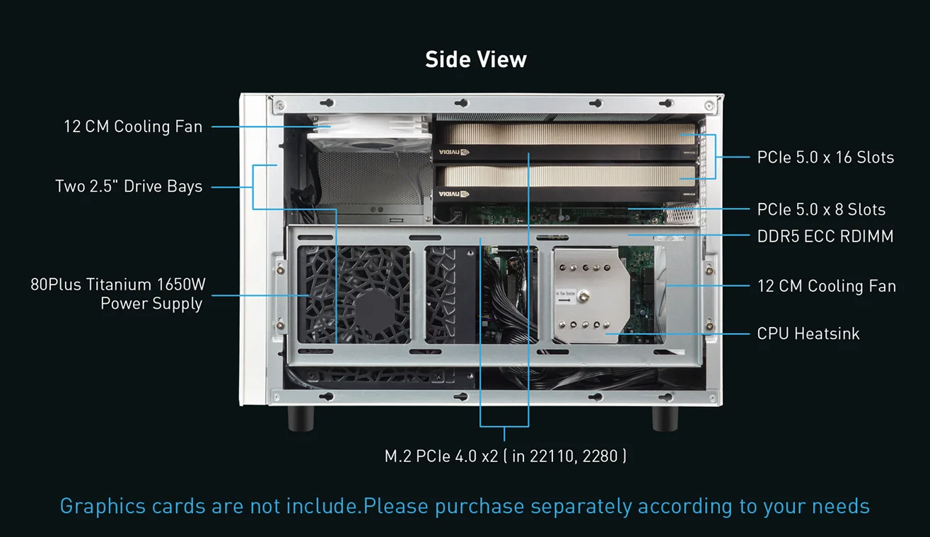 Supports up to 2× RTX PRO 6000 Max-Q Workstation Edition GPUs, provide 192GB of GPU memory in a single workstation